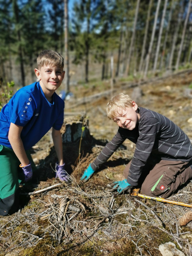 Nach einem ca. 3 km steil bergauf führenden Weg zur Pulswinkelhütte lernte ein Teil der Klasse, welche Bäume in den heimischen Wäldern wachsen und woran man diese erkennen kann. Danach wurden in einem abgeholzten Waldstück 100 Kirschbäume und Linden gesetzt. Die andere Gruppe bekam von der Försterin viele interessante Einblicke in das Leben im Wald und baute Vogelnester.